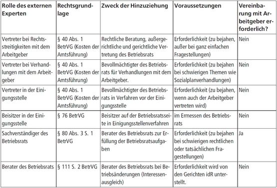 Der Betriebsrat kann sich zudem der Unterstützung externer Experten bedienen. So kann er sich beispielsweise in schwierigen Fällen bei Verhandlungen mit dem Arbeitgeber, bei Rechtsstreitigkeiten und auch bei Verfahren vor der Einigungsstelle durch Fachleute beraten und vertreten lassen.